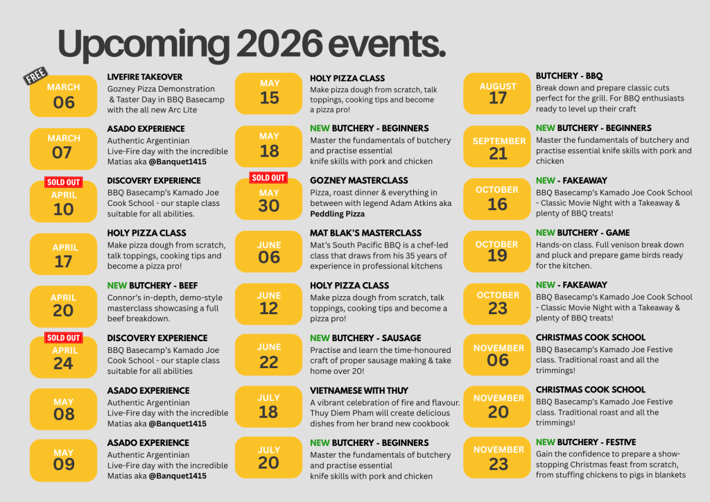 We have all fallen in love with outdoor cooking throughout lockdown, and from hosting demo days in store most weekends in the summer. We launched BBQ Basecamp Cook School in March 2023 offering exclusive hands on cooking experiences in our self built shack (by team Basecamp’s John). If you join us, you will cook, learn, chat, eat and drink until your hearts (and belly’s) content. From sizzling steaks to juicy kebabs, curries, paella, sweet treats and more, we will show you how to create delicious quality dishes on your grills, in the comfort of your own garden.
